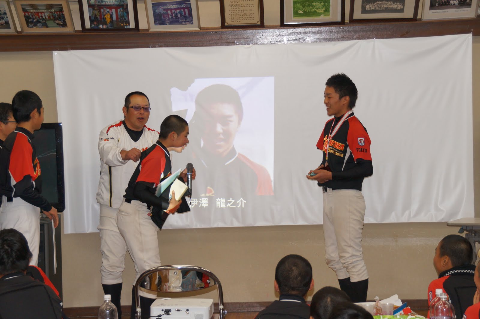 スタッフ/保護者チームとのお別れ試合を楽しんだ後、9名は会場となる北野公会堂に向かいました。1、2年選手、スタッフ、保護者に拍手で迎えられてにこやかに会場入り。卒団証書授与、歓談、伊藤顧問からの祝辞……とセレモニーが進んだところで、立石マネジャー登場!から、爆笑の選手紹介が始まりました。山本監督からの贈り言葉に耳を傾け、2年生選手からの記念品贈呈には笑顔で応えた9名。壇上に全員が並び、それぞれスピーチすることろには表情は一変。いつになく神妙、目はウルウル、感極まって……。