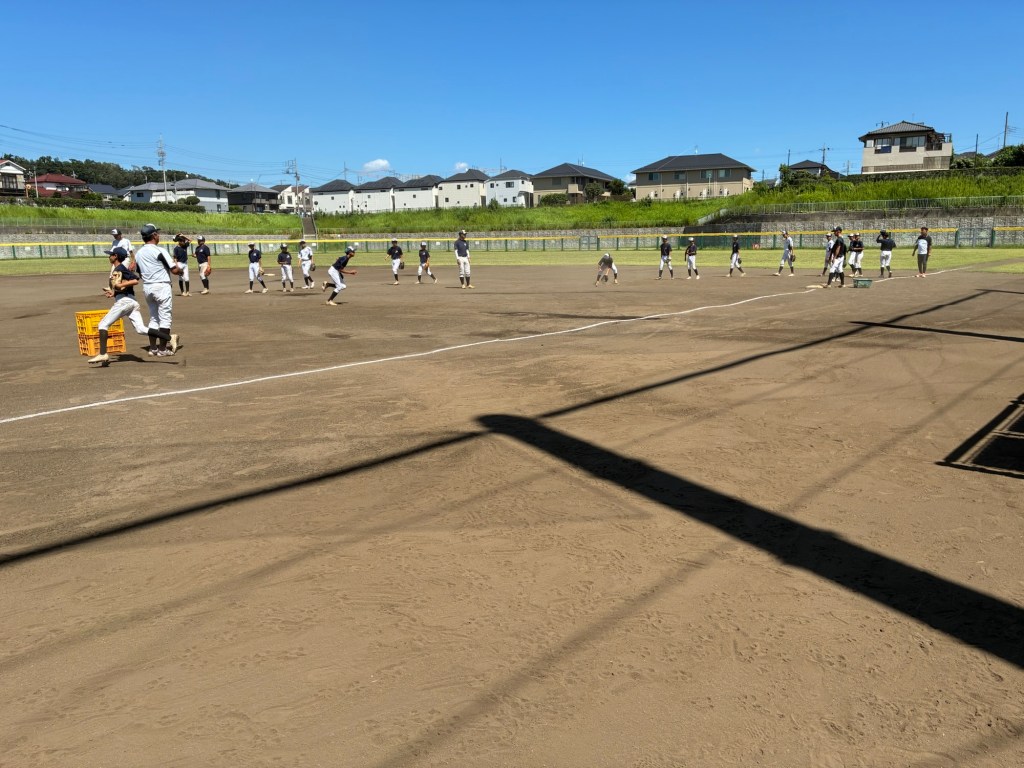 酷暑の中、基本練習からスタートしました。投内連携をミスなくこなせるようになれば勝利は近づくのだ。